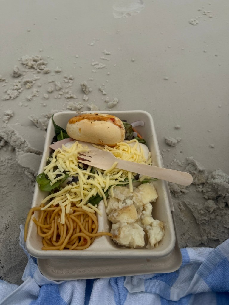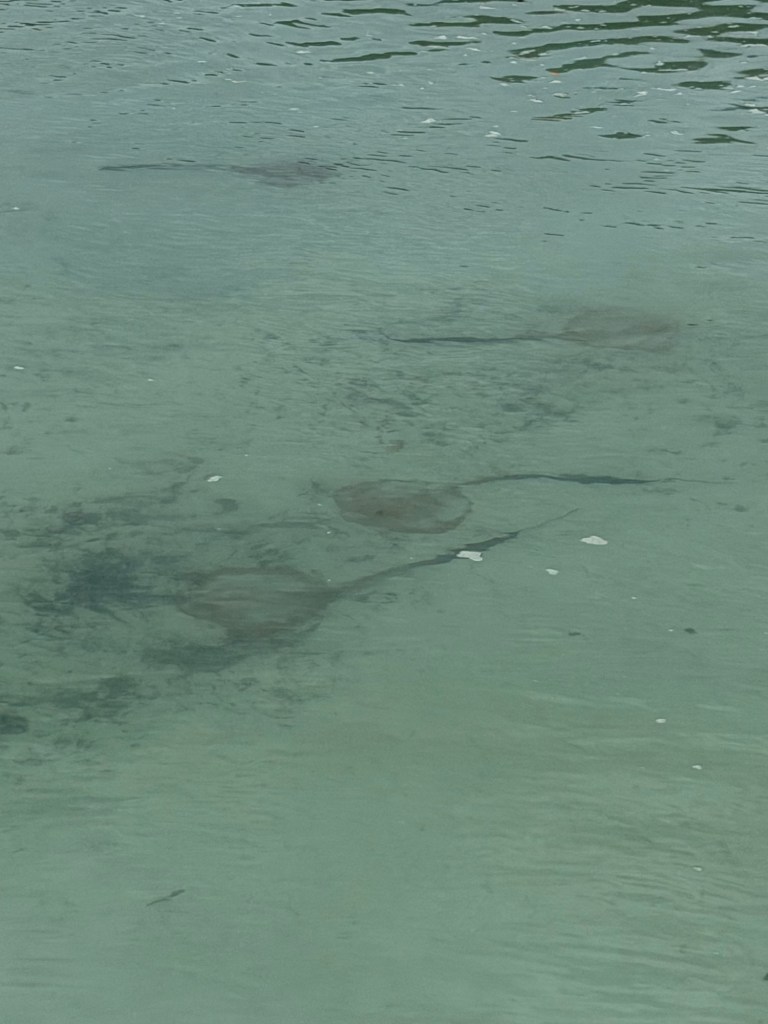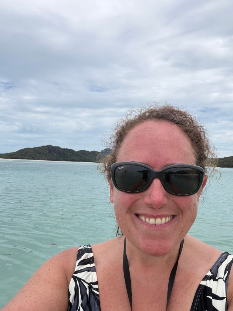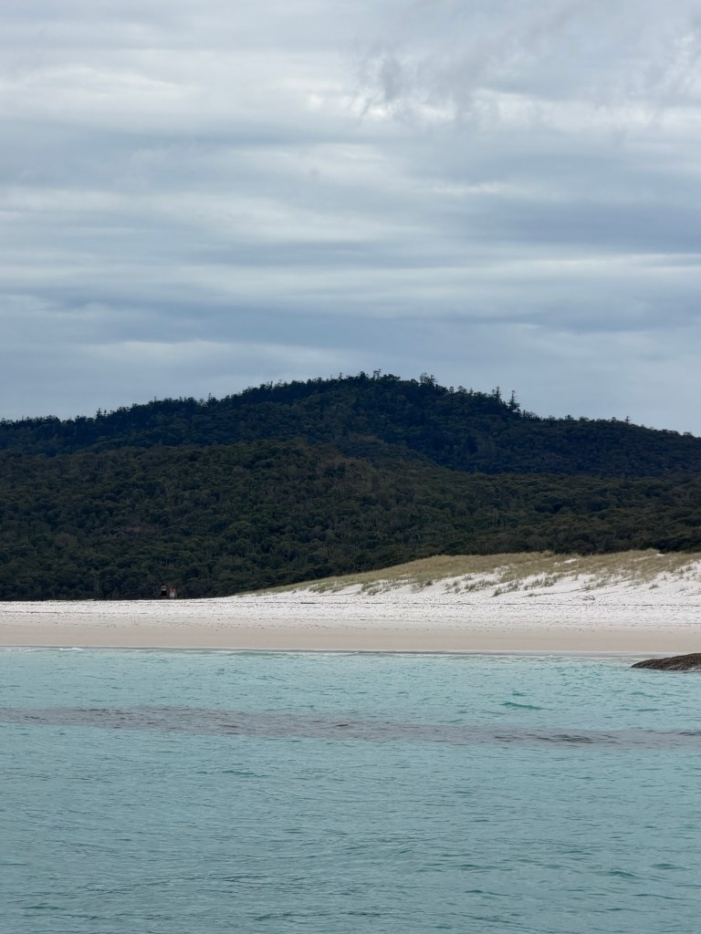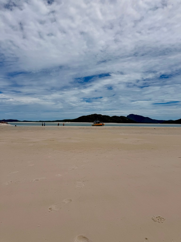 That was the last snorkeling of the day. Our next stop was about 20 minutes away and would be a hike up to these lookouts over the sand formations on Whitsunday Island. I wasn’t really feeling like a hike and when I heard there were 300 stairs involved, I decided I would hang at the beach instead. So I went with the captain as he drove the boat to another beach that would also be our lunch spot. As soon as we got to the beach the captain pointed out all of the sting rad and lemon sharks in the water! He said neither is dangerous as long as you don’t fuck with them. Noted! So while the rest of the group was hiking I got out of the boat and wandered around. The sand is practically indescribable. SO soft! It was almost like a very soft mud/wet powdered sugar kinda. When I got off the boat I was in a sandbar area that had 2 inches of water to about 3 feet. All very shallow. And every time I turned around I saw either a lemon shark or a sting ray! I’ve never seen a sting ray in the wild before so that wA really cool. And the lemon sharks were really small. The captain said they were babies. They ranged in size from about 1-3 feet at most. They could care less that I was there. Amen. I walked around the water and took a lot of pics. When the group returned lunch was served. Not my favorite? Everyone got a boxed lunch that consisted of a salad topped with a piece of turkey, a slice of salami and a slice of ham. Plus spicy noodles and potato salad. Not really my thing but I had enough so I wasn’t starving. I had put my yeti and towel on the beach when we first got there so I went back to them with my lunch. It was very peaceful by myself. Most of the group ate on the boat. I was surrounded by birds who wanted my lunch but I refrained from feeding them. After lunch I decided to spend the rest of my time there laying out. It was really relaxing. And at 2:15 it was time to depart. The captain did a few crazy maneuvers again and hauled ass to get those couples back to their island and then we finally reached our marina at about 3:15. It was a pray to spend the day! It was mostly overcast all day – no rain – so I wouldn’t have wanted to sit by the pool or go to the beach locally. So it all worked out!