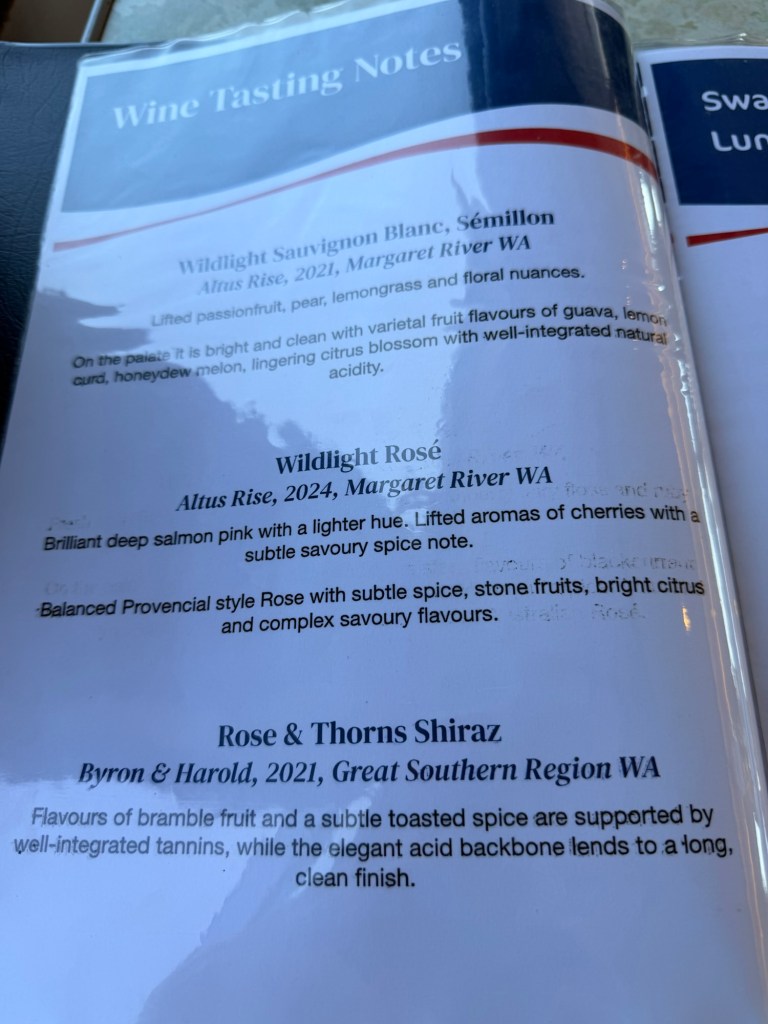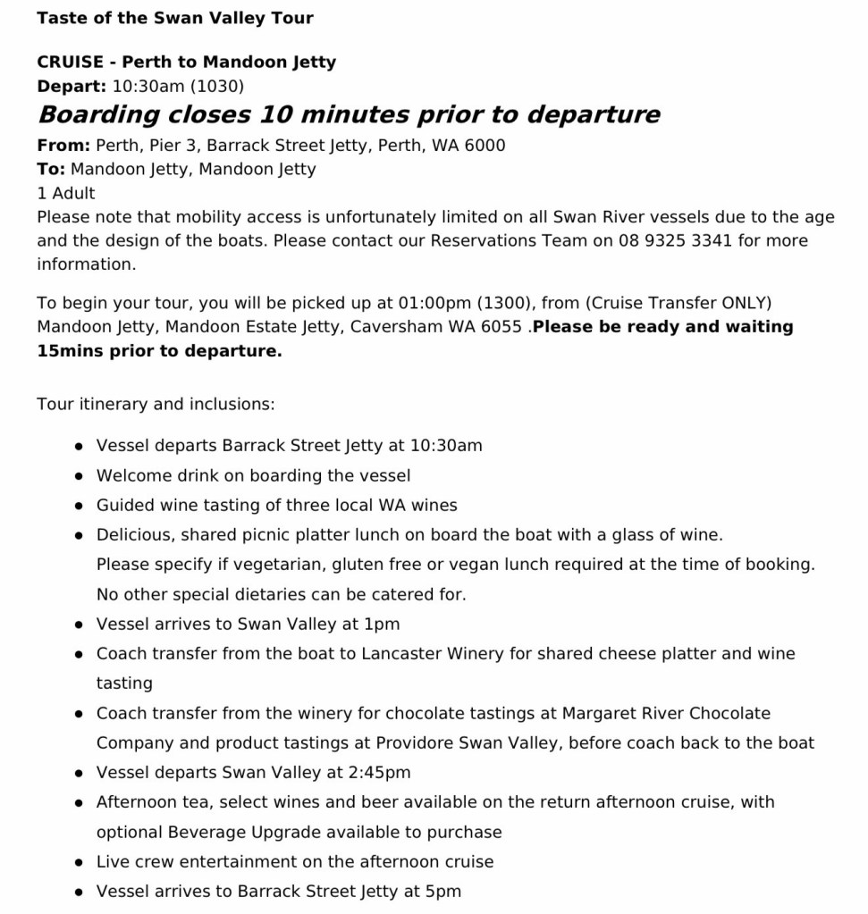 Had planned to do a Swan river cruise that I knew included a 2 hour river cruise from Perth to the wine country, lunch, a winery visit and a visit to a chocolate factory before the 2 hour cruise back to Perth. That’s really all the details I had. I didn’t look at trip advisor or anything. Just a brief mention of the cruise line company in the lonely planet book. Definitely a highlight so far!