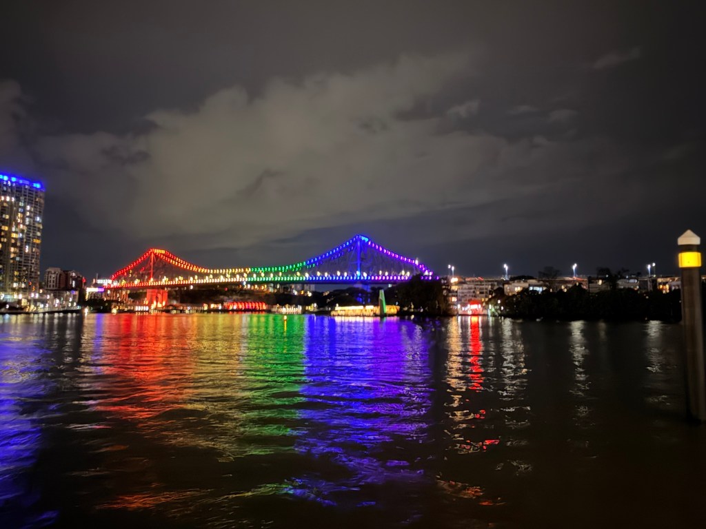 It was still drizzling when I finished but I decided to walk back to the Airbnb using the beach boardwalk (it’s on the river). The Story Bridge was lit up for Pride and it was beautiful!! Great walk back to digest everything. I also discovered a short cut for getting to and from the Airbnb and the boardwalk.